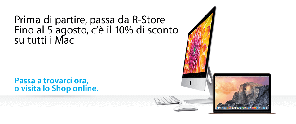 State per partire per le vacanze? Vi conviene approfittare di una occasione che vi consente di comprare con il 10% di sconto tutti i Mac. L’offerta arriva da R-Store, importante catena di APR, Apple Premium Resellers, che opera a Roma, Campania e Basilicata, ma che ha fissato una data di scadenza per la promozione: dopodomani 5 agosto