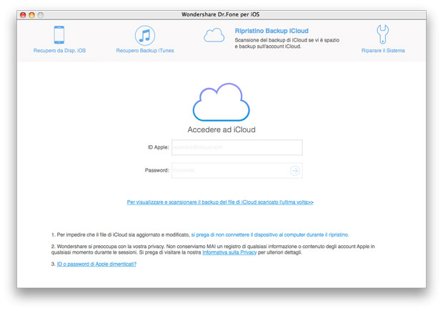 Di questo software abbiamo già parlato in passato in occasione della recensione che vi invitiamo a leggere (click qui) per scoprirne di più. Qui ci limitiamo nel dire che Dr.Fone fornisce due semplici e rapidi modi per ripristinare dati iPhone, iPad e iPod touch: direttamente dal dispositivo o tramite estrazione del backup iTunes e iCloud. In entrambi i casi, è possibile visualizzare in anteprima in modo chiaro tutti i contatti, messaggi di testo, foto e molto altro ancora prima del recupero, così da ripristinare soltanto ciò che si desidera veramente.