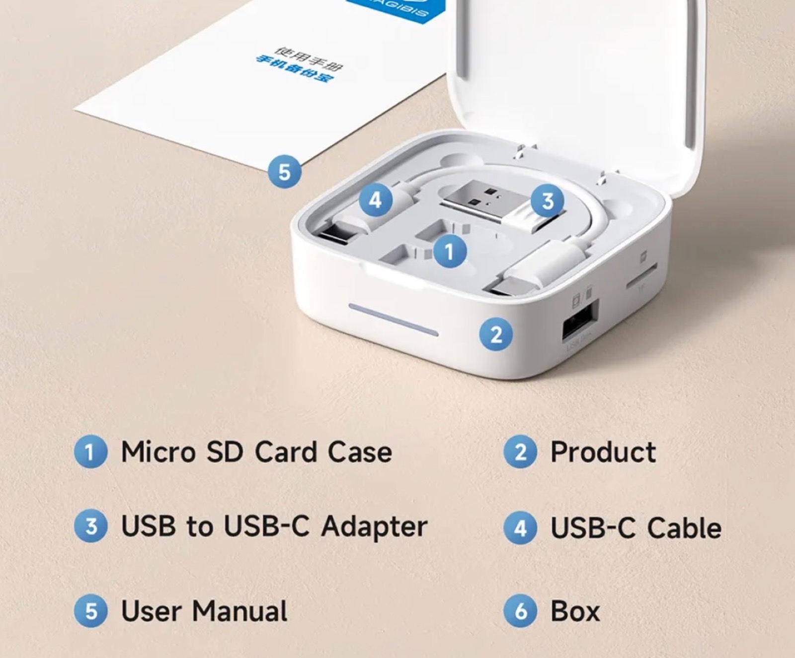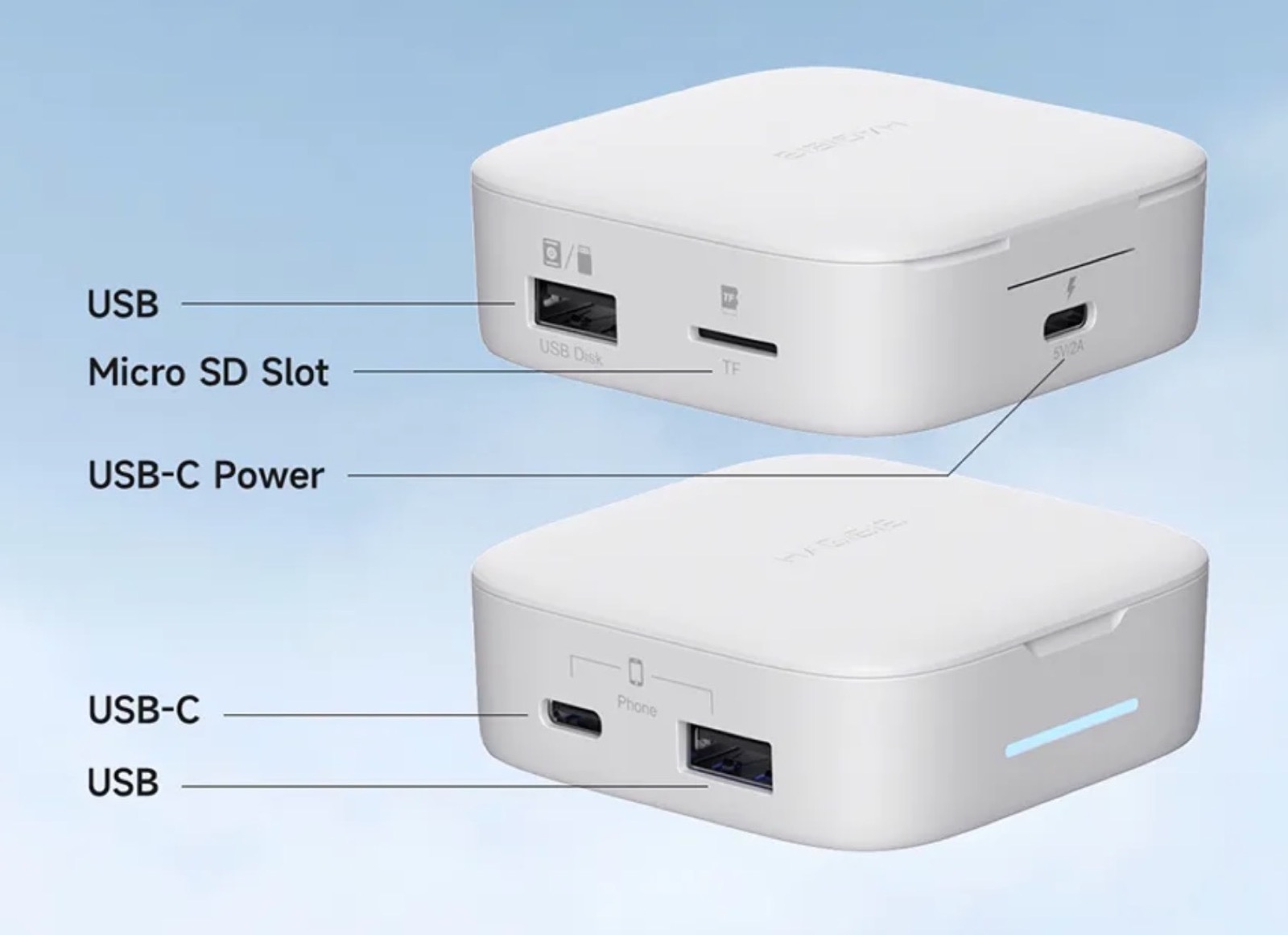 Come una piccola scatola, presenta un coperchio che protegge alcuni utili accessori stipati al suo interno. C’è un cavetto con doppia spina USB-C e un adattatore per convertirne una in USB-A, in modo da poterlo usare con i telefoni di vecchia e nuova generazione. C’è anche lo spazio per poter accogliere un paio di microSD, così da averle sempre a portata di mano.