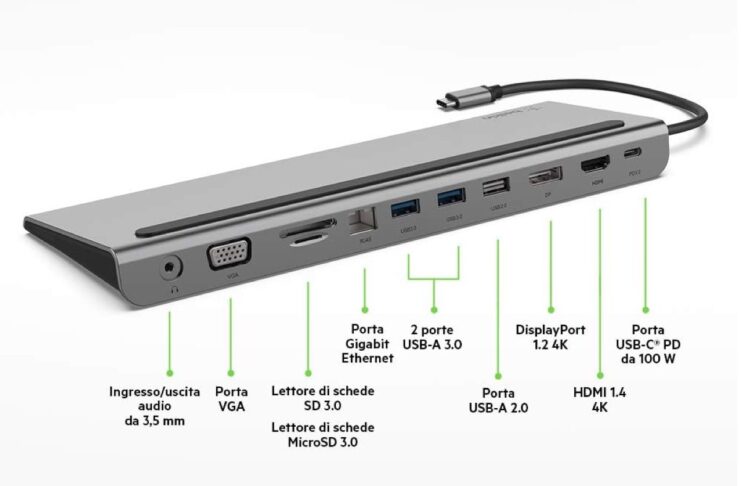 L’hub prima di tutto fa… l’hub. Sfruttando una singola porta USB-C avrete una porta HDMI, 1 porta DP, 1 porta VGA, 3 porte USB-A, 1 porta Gigabit Ethernet, slot per schede SD e MicroSD, 1 porta audio da 3,5 mm e 1 porta USB-C PD.