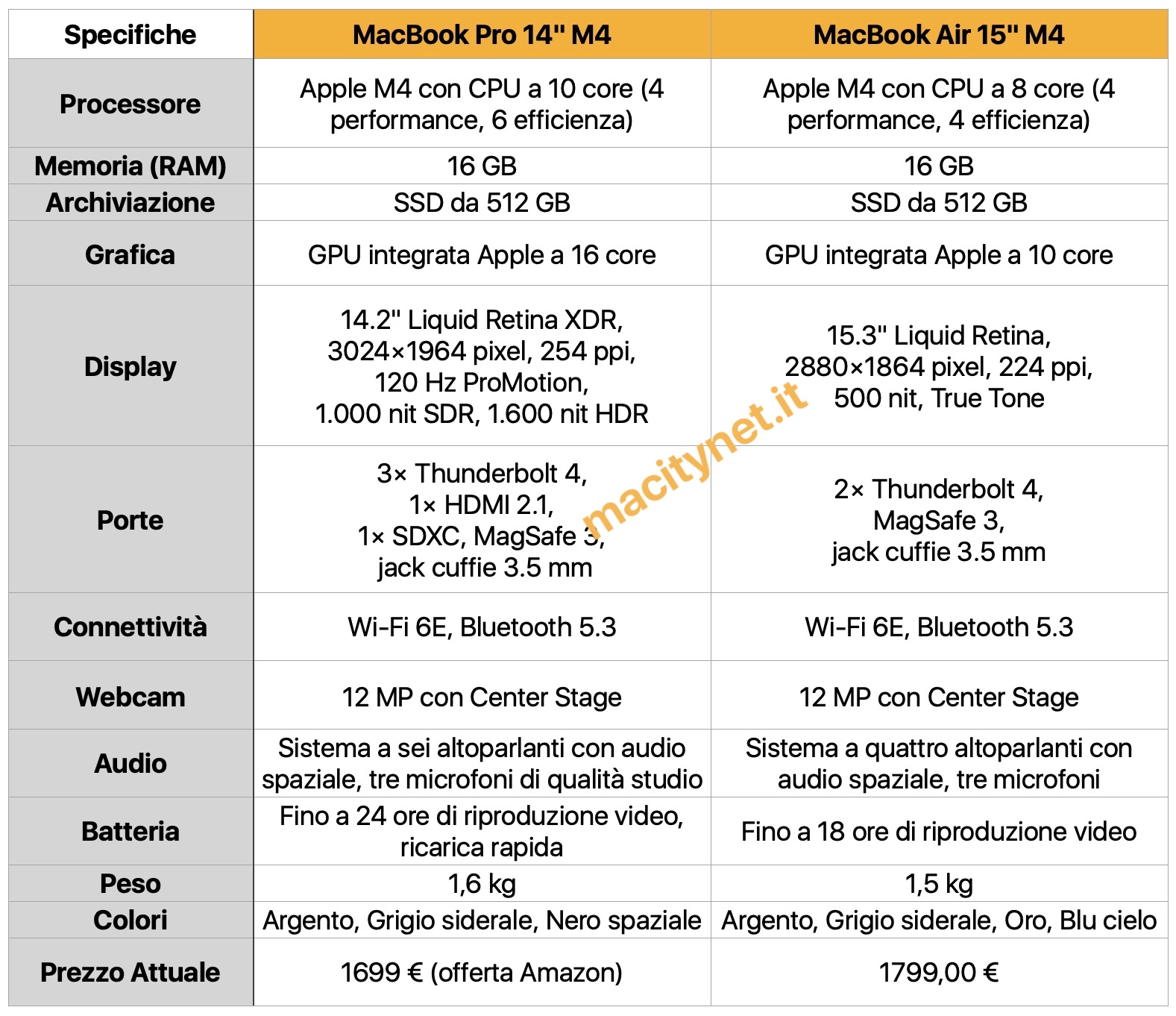 Ne primo caso, stiamo parlando del MacBook Pro M4 Pro, 10 core CPU, 10 core GPU da 14 pollici con 16GB RAM con disco da 512 GB.