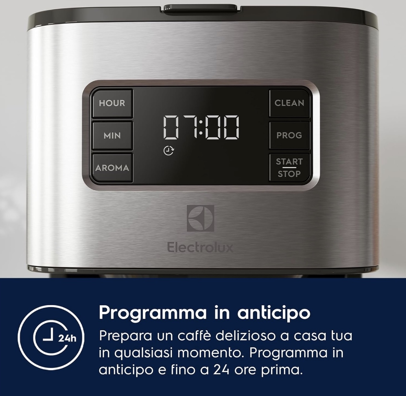 Tra le altre funzioni ci sono l’accensione automatica e lo spegnimento automatico. Quindi potrete avere il caffè pronto e fresco programmando l’ora prevista in cui ne avremo bisogno e non correremo il rischio di lasciarla accesa e consumare energia elettrica inutilmente.