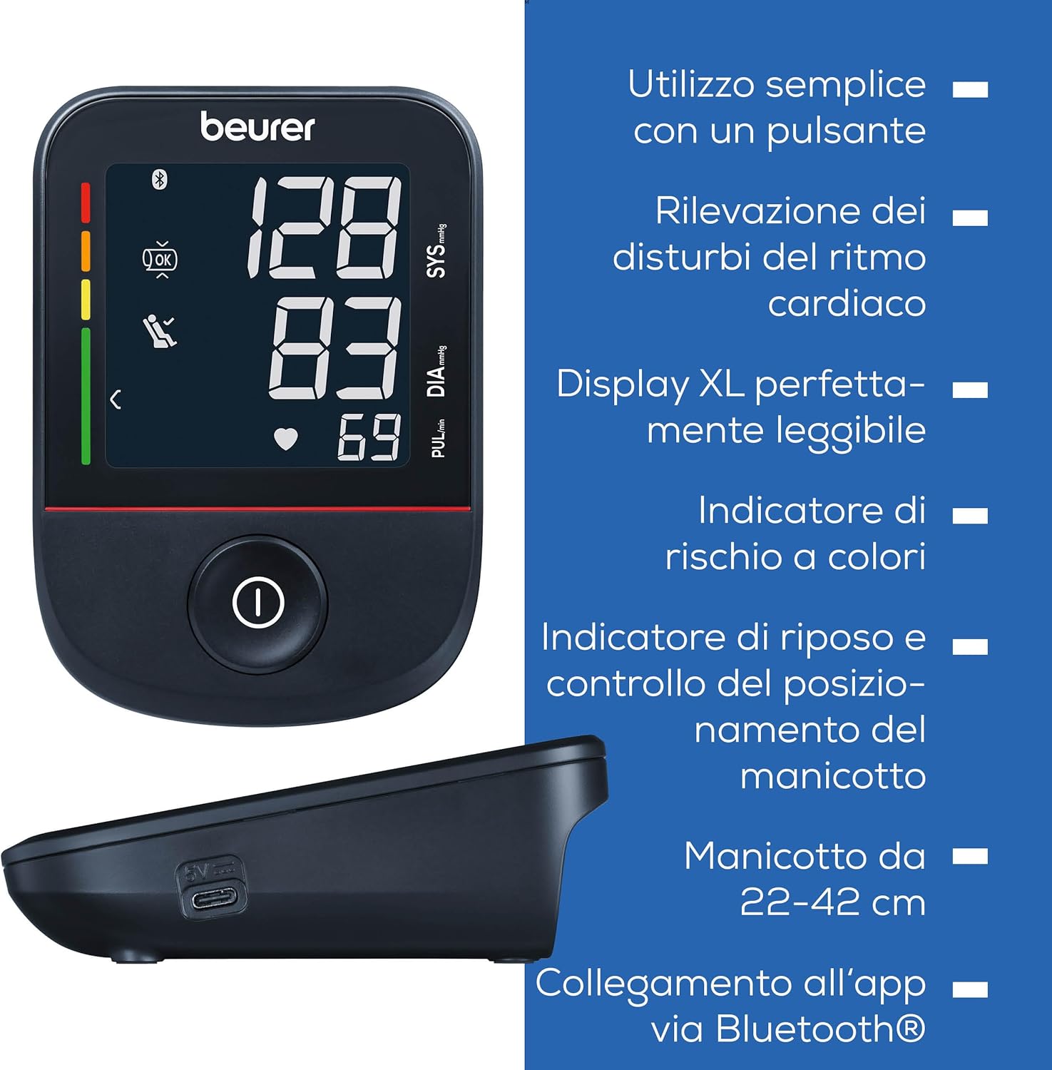 Il Beurer BM 48 misura la pressione e il battito cardiaco direttamente sul braccio, con attivazione a singolo pulsante per un utilizzo immediato. Grazie alla connessione con l’app gratuita HealthManager Pro, è possibile salvare e monitorare i valori nel tempo su smartphone. La funzione di rilevazione delle aritmie cardiache consente di individuare eventuali irregolarità, con segnalazione automatica sul display.