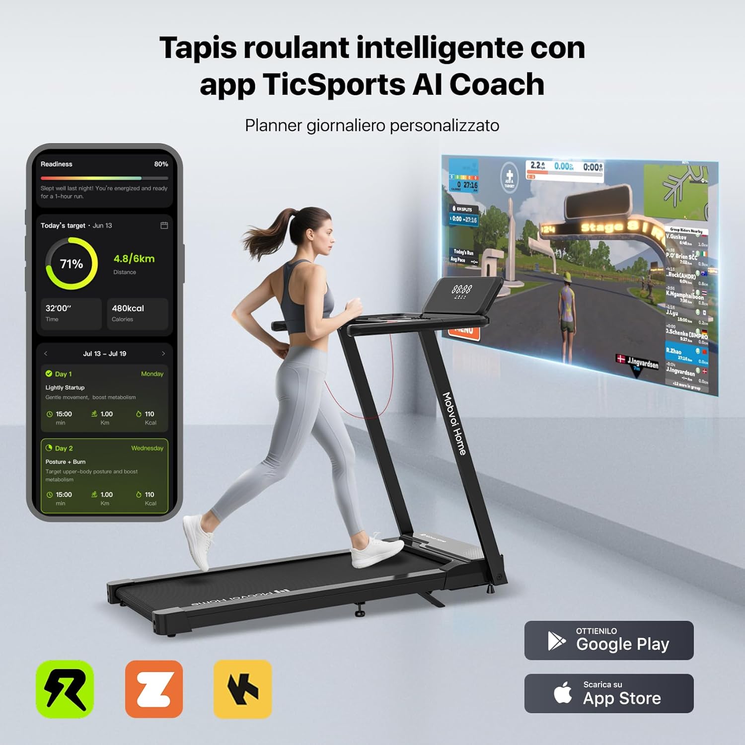 Tre modalità distinte permettono di usare il tappeto per camminare (1-6 km/h), lavorare in piedi e correre fino a 12 km/h. Il passaggio tra modalità avviene facilmente grazie all’hub di controllo olistico e ai pulsanti rapidi per regolare la velocità. L’integrazione con l’app TicSports consente di accedere a programmi personalizzati, statistiche in tempo reale e coaching con intelligenza artificiale. L’uso combinato delle funzioni app e hardware rende il prodotto adatto a chi vuole monitorare i progressi quotidiani senza ricorrere a strumenti aggiuntivi.