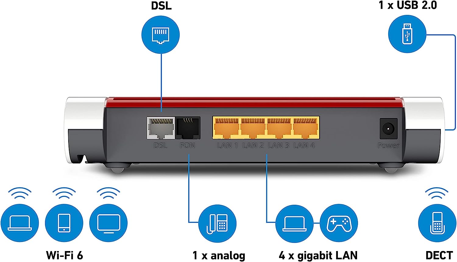 Offre una velocità Internet fino a 300 Mbps con VDSL-Supervectoring 35b; WLAN-Mesh: combinazione automatica dei prodotti Fritz in una rete Wi-Fi intelligente con prestazioni ottimali; porta WAN per la connettività con modem via cavo o terminale a fibra ottica.