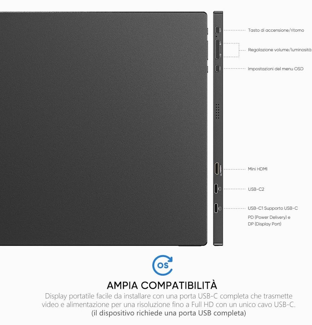 Una delle caratteristiche più apprezzate è la sua immediatezza d’uso: basta un solo cavo USB-C per trasmettere alimentazione e segnale video, senza necessità di driver o software. È compatibile con una vasta gamma di dispositivi: da laptop Windows e Mac a console come PS4, PS5, Xbox, Nintendo Switch, passando per smartphone e tablet dotati di USB-C video. È incluso anche un ingresso mini HDMI, utile per connessioni più tradizionali.