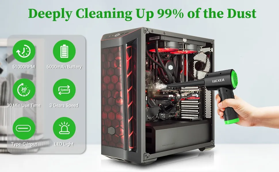 Questo piccolo accessorio fa quello che fanno le classiche bombolette ad aria compressa con la differenza che non è usa e getta. Basta infatti collegarlo ad un caricabatterie per ripristinare la capacità di spazzare via particelle di polvere o i classici “gomitolini” di fibre tessili si si infilano ovunque dentro ai computer da tavolo e anche ai portatili trasformandoli in elementi poco igienici.