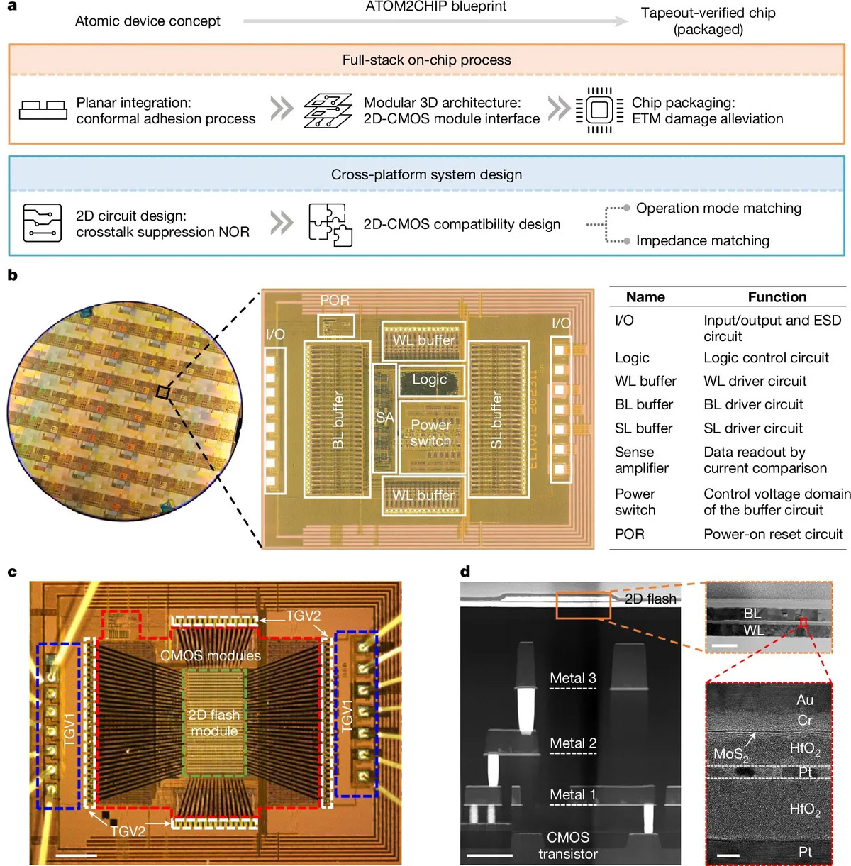 Sfruttando un processo produttivo che il team ha ribattezzato ATOM2CHIP, i ricercatori sono riusciti a creare un livello di bisolfuro di molibdeno di pochi atomi di spessore che è possibile collocare direttamente in cima a un convenzionale chip di silicio da 0,13 micrometri. Il risultato ottenuto è un chip ibrido che combina un array di memoria flash 2D NOR con un controller CMOS standard, colmando efficacemente il divario tra nanomateriali sperimentali e standard di fabbricazione industriale.