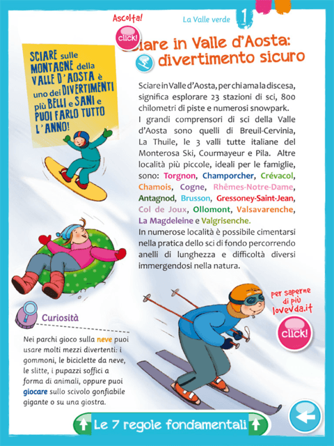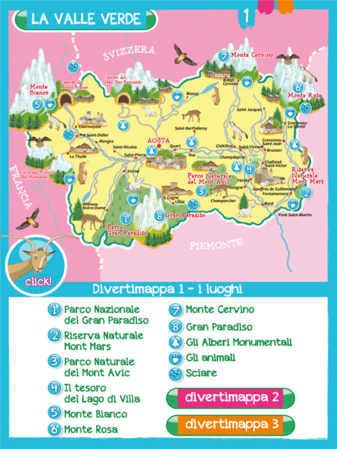 Ad ognuno dei personaggi corrisponde una mappa abbinata: “La Valle Verde”, per esplorare flora e fauna dei parchi naturali e delle montagne, “La Valle antica” per scoprire chiese e castelli valdostani e “Le Valle bella e buona” per conoscere gli aspetti più tradizionali di questa regione. Cliccando sui numeri o simboli, i viaggiatori potranno trovare le pagine con informazioni turistiche, disegni, curiosità, consigli, animazioni, tracce audio e venti minigame (un test per capire se sei un bravo sciatore, la possibilità di colorare i fiori di montagna, individuare animali intrusi in mezzo a una mandria di mucche variopinte o cercare personaggi che si nascondono tra le torri di un forte ottocentesco).