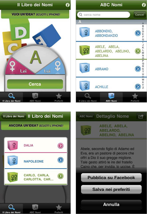 Il database del programma può anche essere utilizzato per ricercare il nome da assegnare a un bambino o per suggerirne uno: è sufficiente scegliere il sesso e poi scuotere leggermente iPhone/touch. Il Libro dei nomi è disponibile su App Store a 1,59 euro.