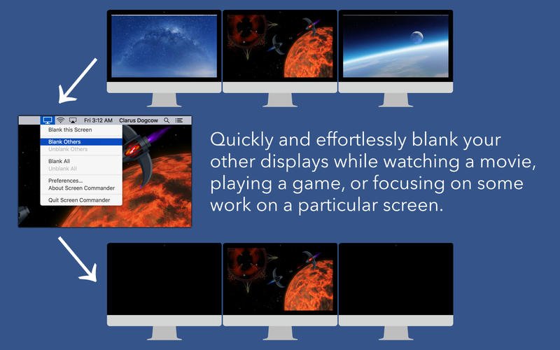 Screen Commander 1.0 è un’utility per Mac pensata per gli utenti che hanno più display connessi al Mac. Il suo scopo è molto semplice: consentire di oscurare gli schermi non usati quando si guarda un filmato, si gioca o l’utente preferisce concentrarsi su un particolare schermo.