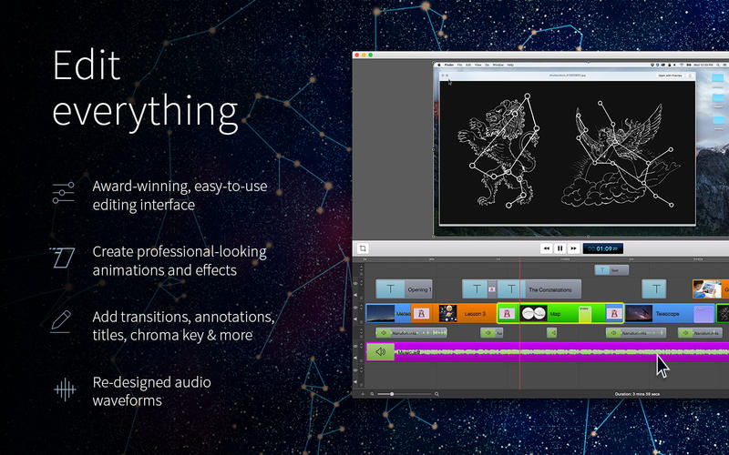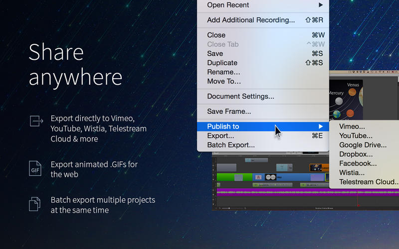 Come sempre il software integra strumenti per la pubblicazione immediata su YouTube, in risoluzione standard o HD, supporta transizioni 2D e 3D, e mette a disposizione un tool che consente di modificare la velocità di recording e editing, integra strumenti per migliorare la gestione dell’audio. E’ possibile avere, ad esempio, una traccia con la voce e un’altra con la musica, regolando di fino l’audio della seconda. La traccia con l’audio e il video importata in fase di screencasting può essere separata e si può lavorare sulle due tracce in modo indipendente.