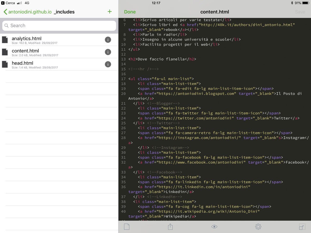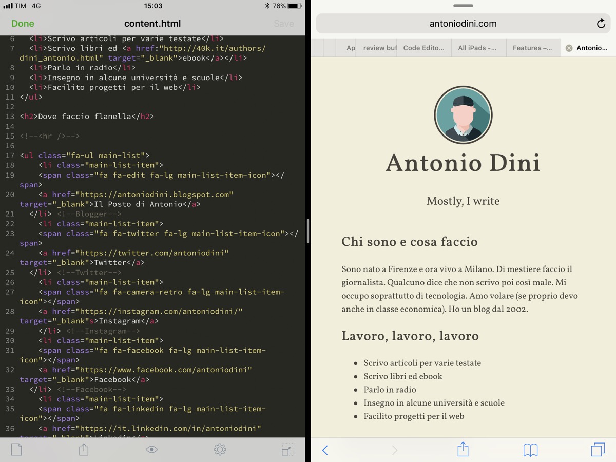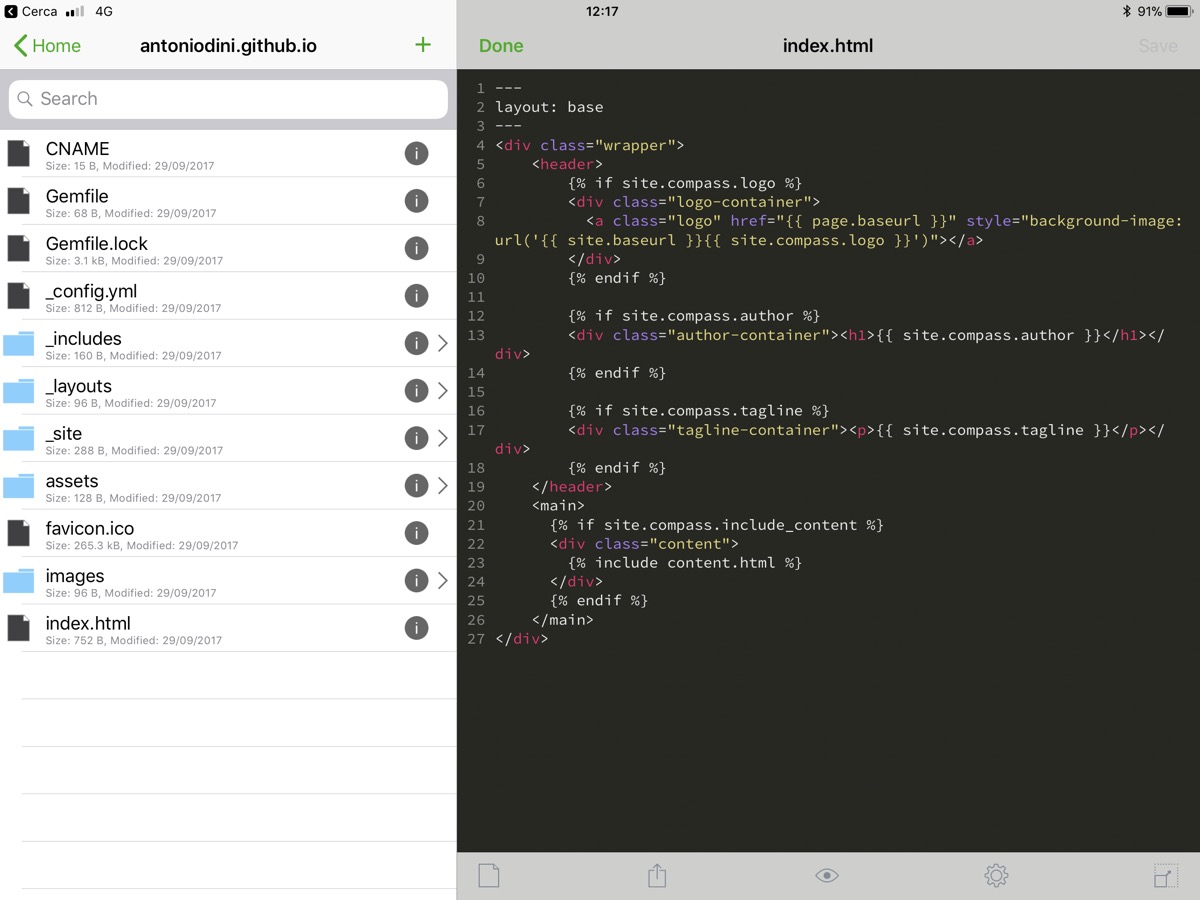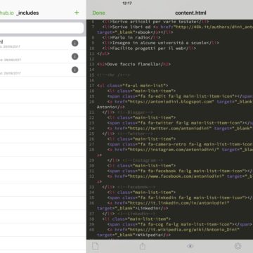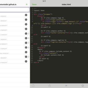 La prima è che il default su iPad è molto gradevole da usare e che l’app non ci è mai andata in crash durante le settimane di utilizzo. La seconda è che l’aggiunta dei repository a base git è un enorme valore aggiunto che semplifica fortemente il lavoro di connessione. La prova è stata fatta editando il sito web statico che è su github. Sarebbe stato possibile lavorarci lo stesso “girando attorno” al problema con l’uso di una connessione diretta su Github. Ma, avendo a disposizione il client di Git permette di lavorare in maniera nativa e molto più naturale, anche offline.