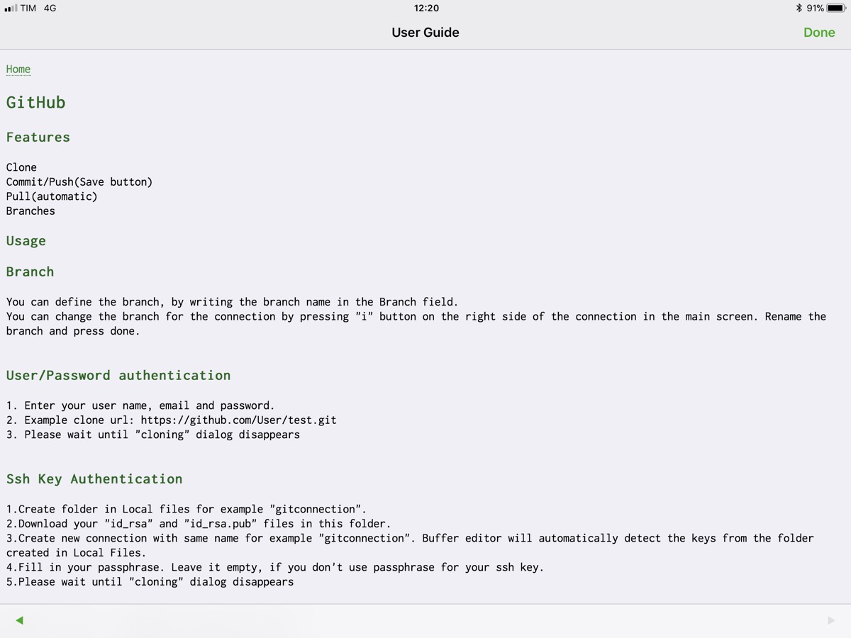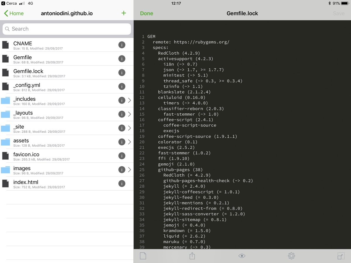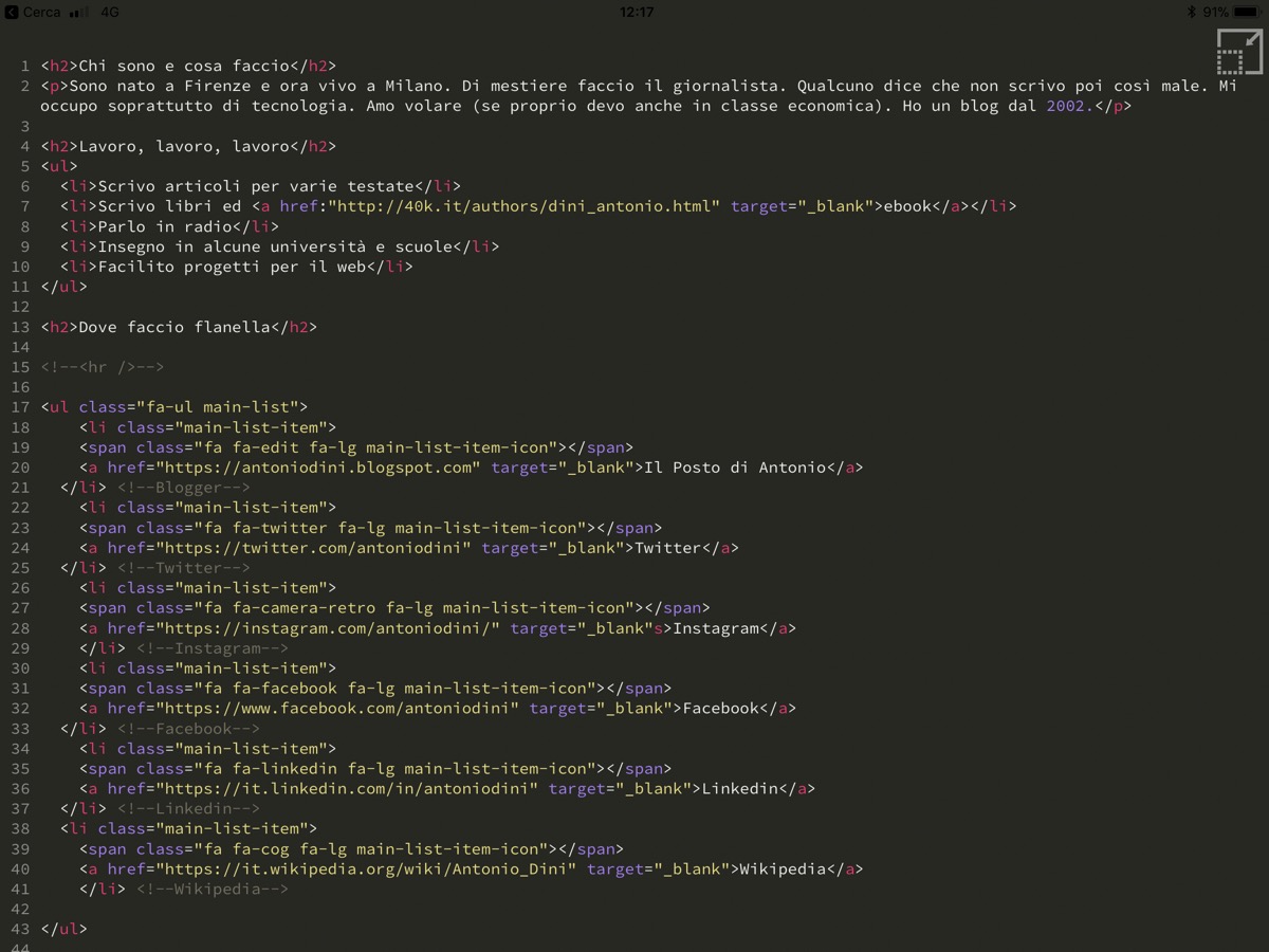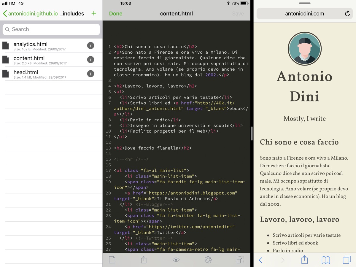 La prima è che il default su iPad è molto gradevole da usare e che l’app non ci è mai andata in crash durante le settimane di utilizzo. La seconda è che l’aggiunta dei repository a base git è un enorme valore aggiunto che semplifica fortemente il lavoro di connessione. La prova è stata fatta editando il sito web statico che è su github. Sarebbe stato possibile lavorarci lo stesso “girando attorno” al problema con l’uso di una connessione diretta su Github. Ma, avendo a disposizione il client di Git permette di lavorare in maniera nativa e molto più naturale, anche offline.