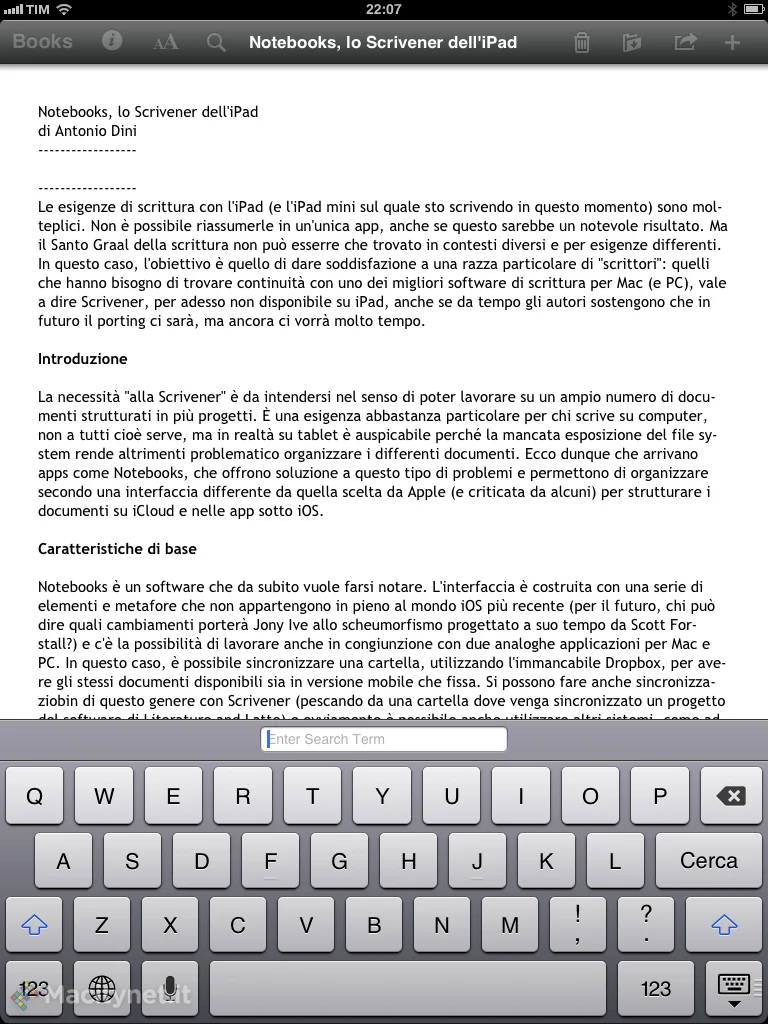 Siamo soddisfatti di Notebooks. È una app innovativa per quanto riguarda l’interfaccia, che però andrebbe ripulita e semplificata un po’ di più a nostro avviso. Le funzionalità sono molte e interessanti, anche se manca la cosa più intuitiva, a nostro parere, cioè l’esportazione diretta in RTF senza tanti fronzoli. Quella via email finisce con tutto il testo nel corpo della mail e non è molto comodo. Utili (anche se ben nascoste…) alcune funzioni sul testo come la possibilità di convertirlo in PDF oppure di comprimerlo o di convertirlo in testo piano/RTF.