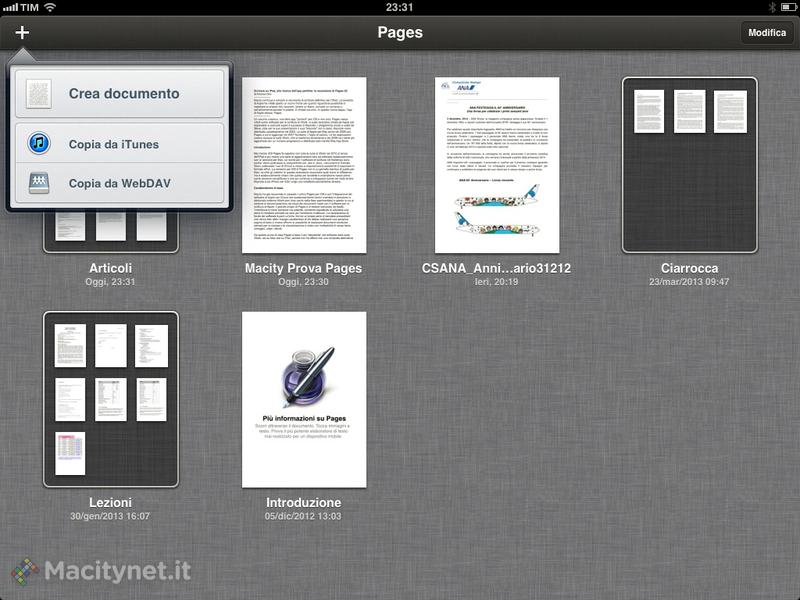 Pages apre e salva documenti nel suo formato nativo, identico tra Mac e iOS seppure con alcune varianti che a volte danno non gravi, ma spesso fastdiosi, errori in fase di passaggio dall’una all’altra piattaforma anche tramite iCloud. Poi consente di esportare documenti con grande facilità (tramite il menu “Condividi e Stampa”) sia verso altre app presenti sull’iPad, sia verso formati da inviare via mail (o tramite iTunes e server WebDav) nei formati più diversi: Pages, Pdf e Word.