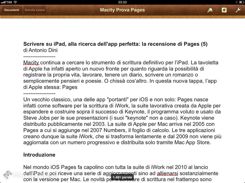 Nel mondo iOS Pages fa capolino con tutta la suite di iWork nel 2010 al lancio dell’iPad e poi riceve una serie di aggiornamenti sino ad allinearsi sostanzialmente con la versione per Mac. Le novità per il software di scrittura nel frattempo sono poche: viene potenziata la compatibilità con .doc e .docx, i documenti in formato Word, potenziato l’uso di iCloud e messa a disposizione la possibilità di esportare in formato ePub. La versione per iOS di Pages non è un gemello identico di quella per Mac: va oltre gli obiettivi di questa recensione raccontare quali siano le differenze, ma è sostanzialmente chiaro che quella per tavolette e smartphone nasce prima come versione semplificata e che poi comincia a svilupparsi (come del resto anche Keynote e poi iPhoto per iOS) lungo una traiettoria parzialmente diversa.
