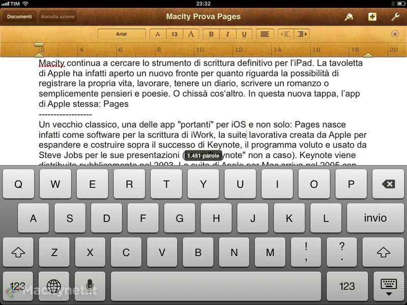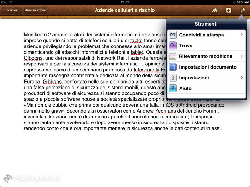 Chi scrive prova piacere nell’usare un buon programma, completo e potente, tanto quanto gradisce un programma essenziale e veloce. È un po’ come guidare potenti berline o scattanti spider. Pages è sicuramente la berlina: ma si muove con disinvoltura su molti tipi di ambiente. È in grado di digerire documenti di word complessi, anche molto lunghi (abbiamo provato a copiare il testo da lunghissime pagine web e incollarlo senza che l’iPad mini facesse una piega). Si possono anche facilmente inserire tabelle, oggetti grafici, immagini, e rendere il tutto estremamente pesante ma allo stesso tempo sempre gestibile. Il salvataggio e l’apertura dei documenti su iCloud non è la cosa più veloce che abbia visto in vita mia e si sente la mancanza della possibilità di accedere direttamente a Dropbox. Invece l’integrazione con il rullino delle foto dell’iPad è straordinario, così come alcune intuizioni dell’interfaccia. Il costo non è basso, ma Pages potrebbe anche essere l’unico software per scrivere di cui c’è bisogno, se non fosse per quel paio di lacune – tra cui la compatibilità con i documenti RTF e OpenOffice, oltre al contabattute.