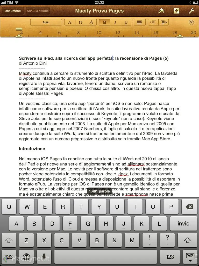 Macity ha già raccontato in passato il primo Pages per iOS e poi l’integrazione dei software di Apple con iCloud che sostanzialmente hanno mandato in pensione lo sfortunato sistema iWork.com (mai uscito dalla fase sperimentale) e aperto la via al sistema di sincronizzazione via cloud dei documenti creati con il software per la scrittura di Apple. Il grande pregio di Pages è di essere realizzato da Apple: l’interfaccia è molto semplice ma potente, consente soprattutto di utilizzare una serie di metafore pensate da zero per l’ambiente multitouch. La caratteristica di fondo del software è però un’altra: fornire un’ampia serie di template precostituiti che vanno ben oltre i bisogni caratteristici di chi debba realizzare una semplice pagina di testo e invece offrono la possibilità di realizzare documenti strutturati pensati per la stampa o la visualizzazione a video con molteplicità di campi testo, immagini, colori, sfondi.