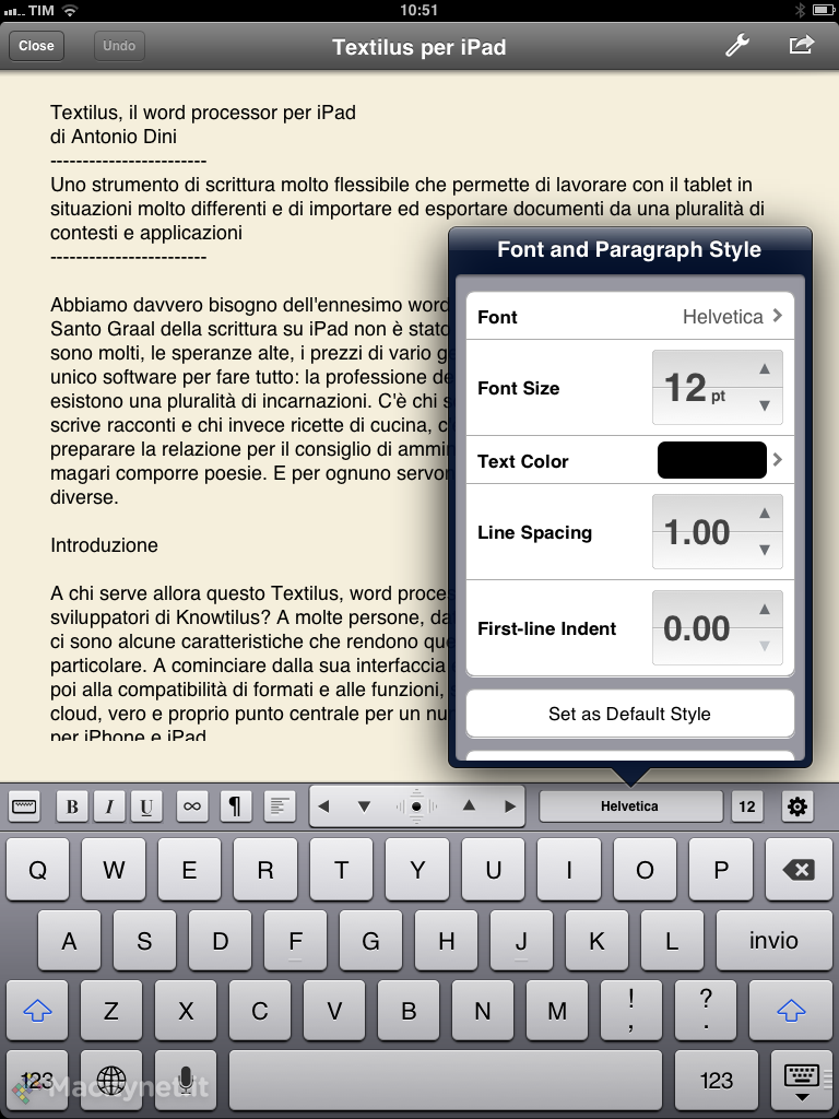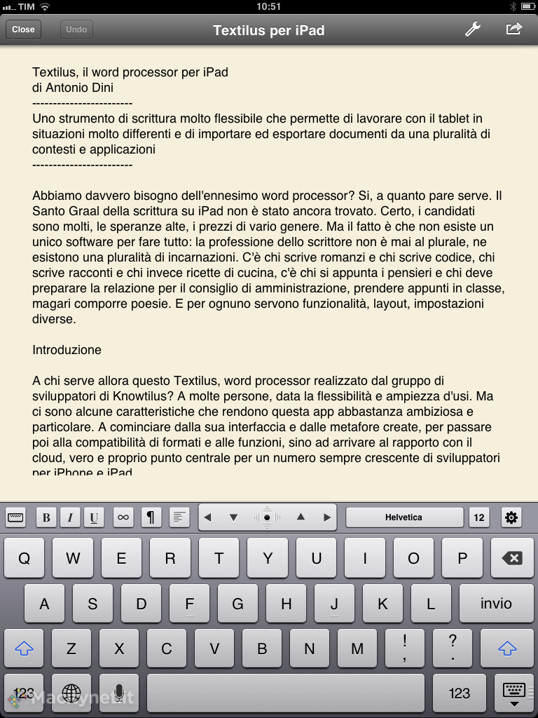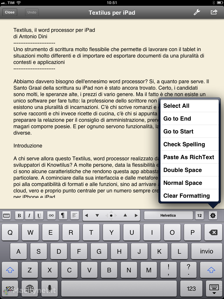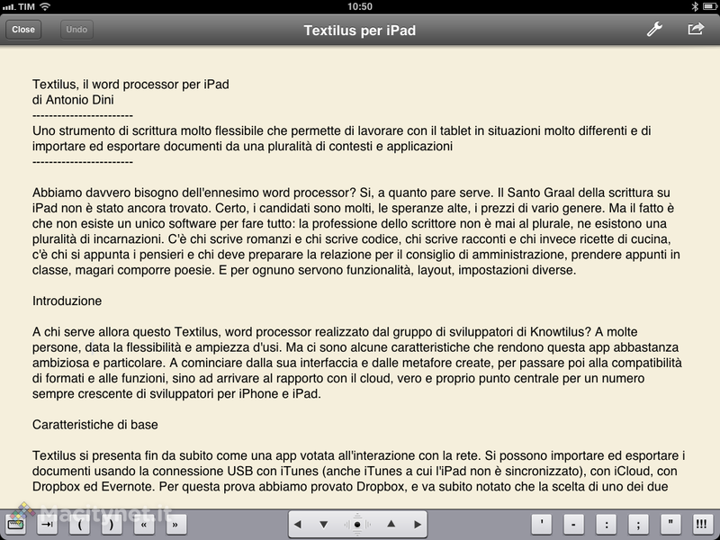 Il campo di scrittura dei documenti è quello tradizionale dei documenti iOS che sfrutta in maniera originale l’innovazione della striscia supplementare per la tastiera virtuale. Per quanto risulta a chi scrive il primo software di scrittura per iOS con tastiera virtuale personalizzata è stato IA Writer, che ha introdotto l’idea di una striscia al di sopra dei tasti tradizionali aggiungendo una serie di comandi (per spostare il cursore a destra e sinistra, avanti e indietro di una parola, aprire e chiudere parentesi, gestire le accentate in maniera intelligente. Textilus espande questa idea aggiungendo una specie di “pointing stick” virtuale, simile concettualmente a quello che utilizzano IBM/Lenovo nei ThinkPad al posto della tradizionale trackpad. Un po’ scomoda l’implementazione di Textilus ma comunque originale e funzionale. La striscia è comunque personalizzabile con altre serie di tasti-funzione (anche qui, punteggiatura, formattazione del testo con font differneti e così via). Utilizzando la tastiera bluetooth, scompare ovviamente la tastiera virtuale ma rimane a disposizione la striscia aggiuntiva.
