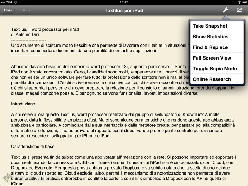 A disposizione, tramite la consueta icona a forma di chiave inglese, la possibilità di prendere snapshot, vedere le statistiche, fare trova e sostituisci, passare alla modalità di vista a finestra piena, mettere/togliere lo sfondo seppia e infine fare delle ricerche online (cioè su Wikipedia) senza dover uscire dall’app, cosa questa molto utile perché consente di introdurre un po’ di multitasking riducendo il bisogno di passare a Safari o ad altri browser. Il fatto che la finestra di navigazione si sovrapponga completamente a quella di scrittura rende però meno utile la funzionalità.