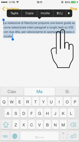 Una delle principali funzioni di iOS, quando si digitano i testi, è quella di poter selezionare facilmente parole per copiarle e incollarle in un altro campo di testo. Il semplice tap con un dito, però, potrebbe essere funzionale nel caso in cui si debba selezionare solo una parola o una piccola frase. Nel caso in cui si debbano invece selezionare blocchi di testo più grandi, o interi paragrafi, il sistema del tap con un singolo dito potrebbe risultare alquanto scomodo. La soluzione per velocizzare il copia incolla su iPhone e iPad e, conseguentemente, per scrivere più velocemente, è quello di eseguire un tap con due dita su un intero paragrafo da selezionare. In questo modo, velocemente e automaticamente, verrà selezionato un intero paragrafo.