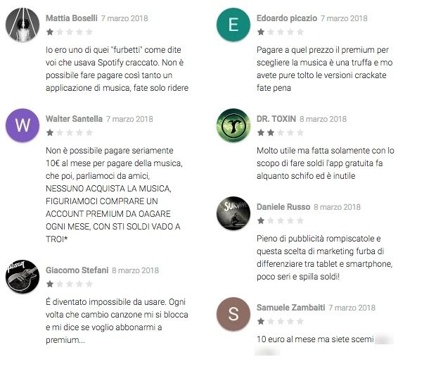 Le conseguenze di questa più che legittima decisione sono state però grottesche: su Google Play Store si è scatenata una sorta di guerra civile digitale, con utenti imbufaliti per il fatto di non poter più “ascoltare a sbafo” musica che invece avrebbero dovuto pagare.