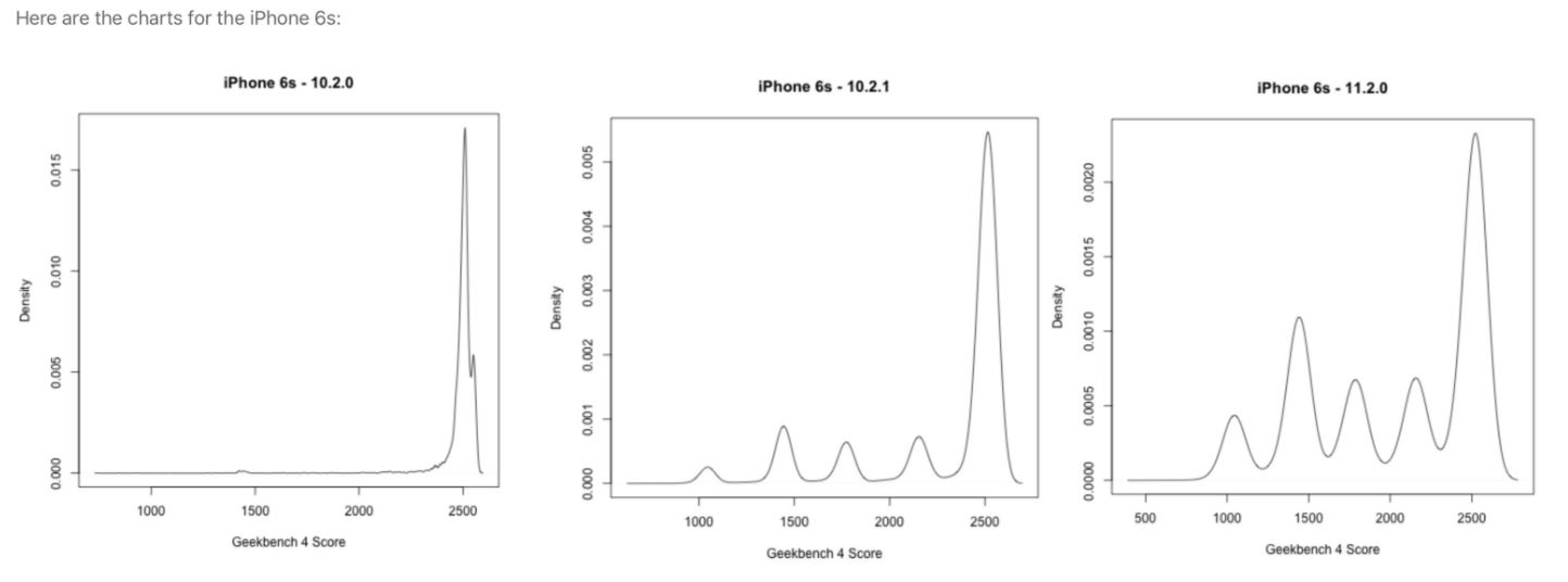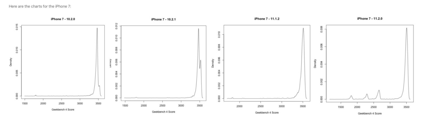 Queste impressioni empiriche sembrano ora confermate dai dati in possesso di Geekbench. Attraverso l’analisi della stima del kernel di densità dei dispositivi, Poole evidenzia che una tale soluzione possa essere stata in effetti utilizzata prima sugli iPhone 6 con iOS 10.2.1 e poi anche anche su iPhone 7 con l’aggiornamento a iOS 11.2: anche in questo caso, l’upgrade ottimizzerebbe l’uso del terminale, riducendo le prestazioni, così da poter meglio funzionare con batterie più datate o usurate.