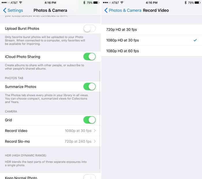 Nelle impostazioni dedicate alla fotocamera gli utenti potranno scegliere diverse opzioni di registrazione: 720p a 30 frame al secondo, 1080p HD a 30 fps e 1080p HD a 60 fps per i video standard mentre per le registrazioni in slow motion sarà possibile impostare 720p HD a 120 fps o 720p HD a 240.