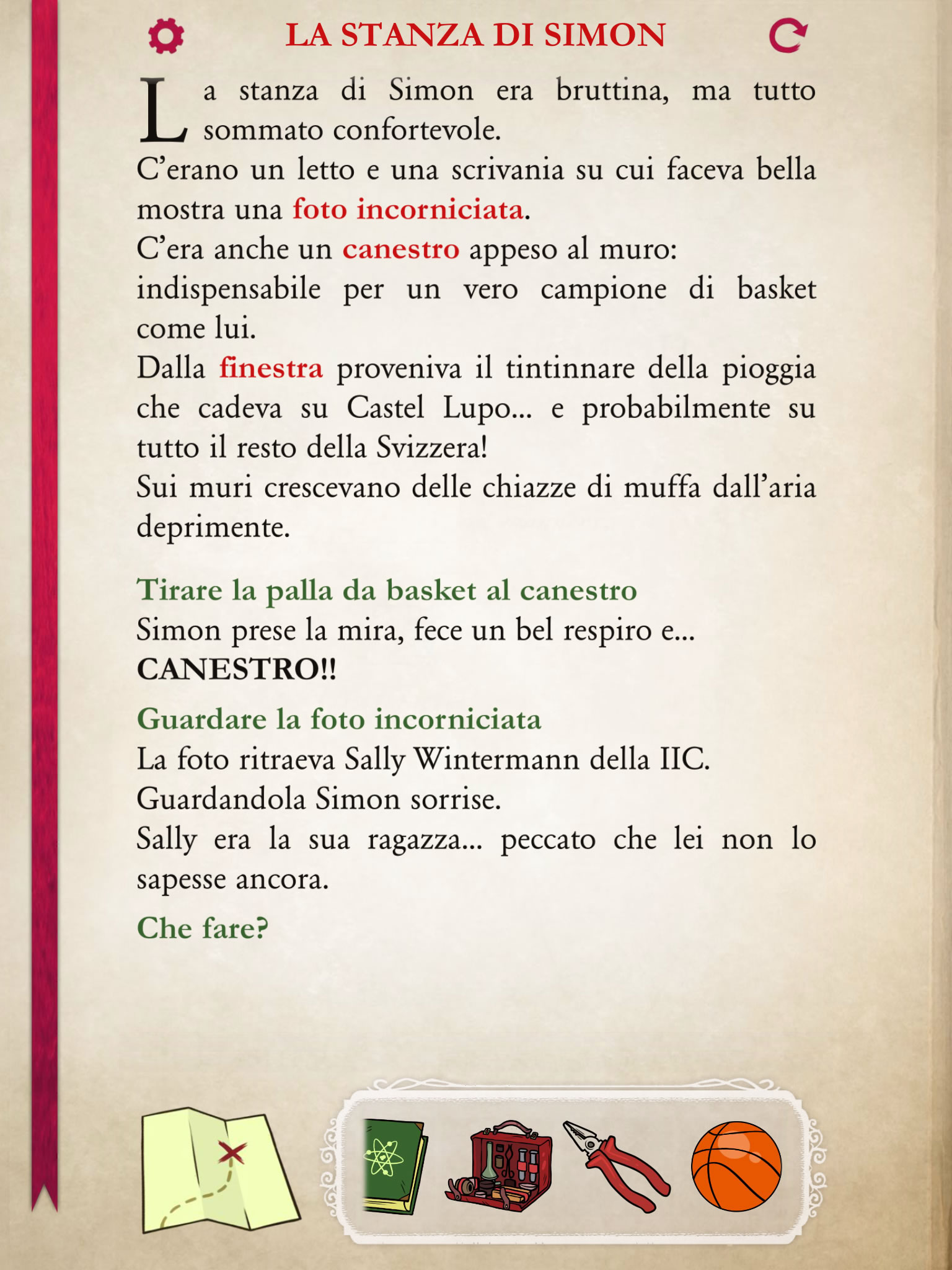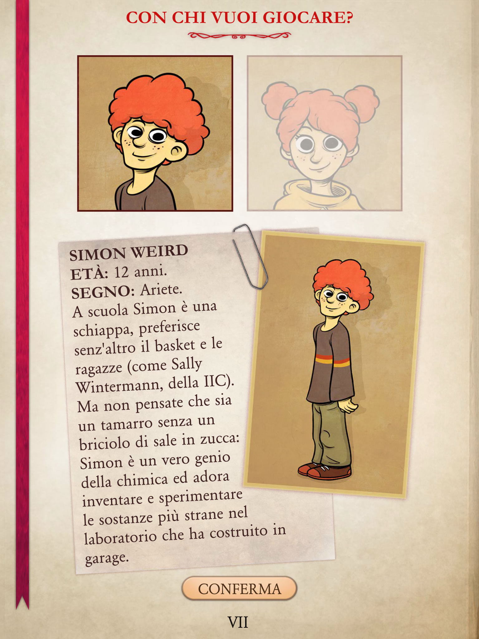 I piccoli lettori si metteranno nei panni dei due gemelli Simon e Violet Weird: dopo aver scoperto di essere i discendenti di un folle alchimista vissuto nel 1500, si metteranno in viaggio verso l’antico castello che hanno ereditato e, una volta giunti al maniero, si troveranno a dover risolvere misteri e a scoprire tutti i segreti del loro lontano parente. Il lettore visiterà virtualmente le stanze di Castel Lupo e con pochi tap deciderà quale sarà la mossa che compiranno i gemelli: utilizzare gli oggetti, risolvere enigmi, interagire con altri personaggi.