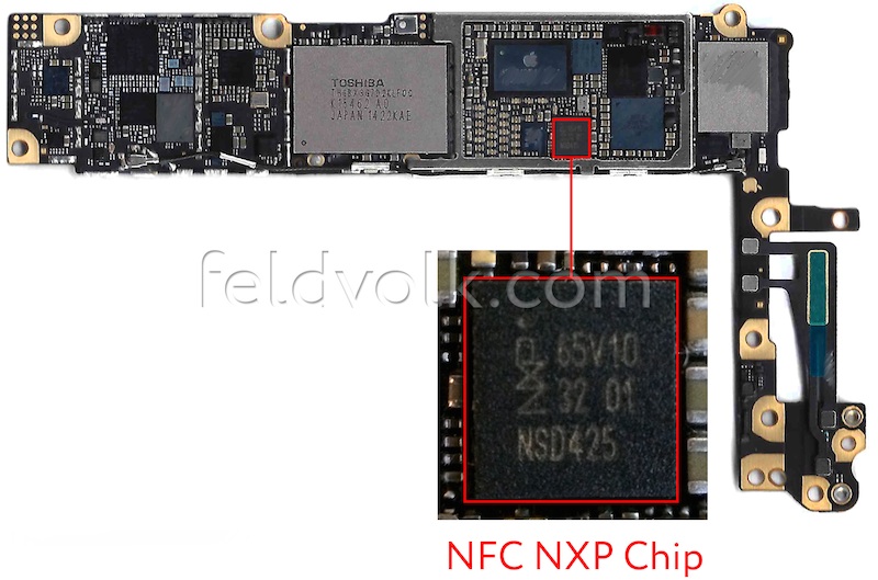 - Ormai certa la presenza del modulo NFC apparso inizialmente in una immagine pubblicata attraverso il blogger Sonny Dickson da Feld & Volk, specializzata in “mod” di iPhone in versione lusso e confermata soltanto di recente con una nuova foto. L’immagine, più nello specifico mostra una scheda madre dove si vede un processore di NXP Semiconductor, una società parte del gruppo Philips che produce chip NFC e che si può definire l’inventrice (con Sony) di questa tecnologia. Nella foto ingrandita si vede collocata sulla scheda madre una componente marcata NSD425 che sarebbe destinata a rendere compatibile il dispositivo on i sistemi NFC.