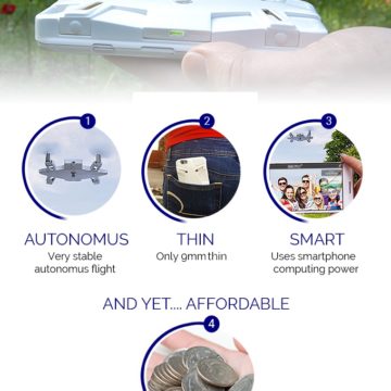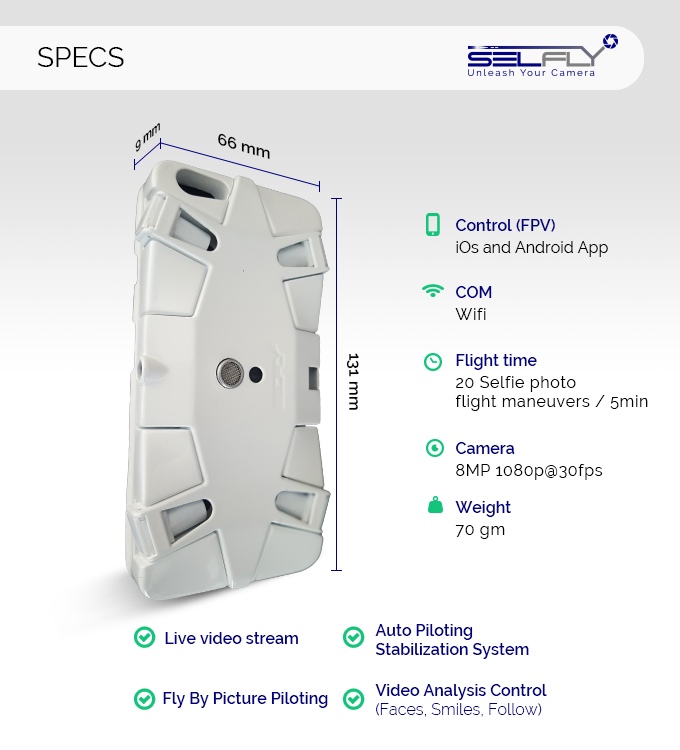Il drone non avrà, ovviamente, un range di volo particolarmente elevato, sia perché collegato in Wi-Fi all’app dello smartphone, sia perché avrà una durata di volo pari a 5 minuti circa, ossia 20 selfie. La camera è da 8 megapixel, con possibilità di registrare filmati a 1080 p a 30 fps, mentre il peso complessivo dell’oggetto è di appena 70 grammi, poco più di una normale cover.