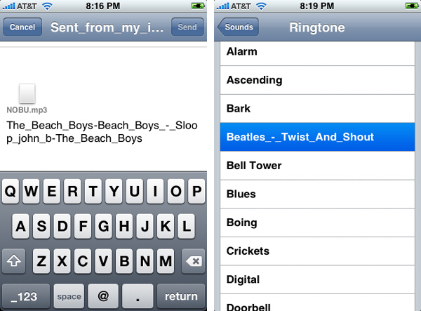 Una volta installato l’applicativo potete decidere di spedire intere canzoni ma anche brevi loop Mp3 o AAC sia verso un indirizzo email per mezzo del programma standard in dotazione sia verso l’archivio delle suonerie che Apple non permette, per una opinabile scelta, di personalizzare.