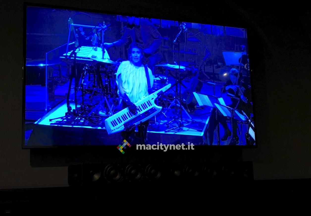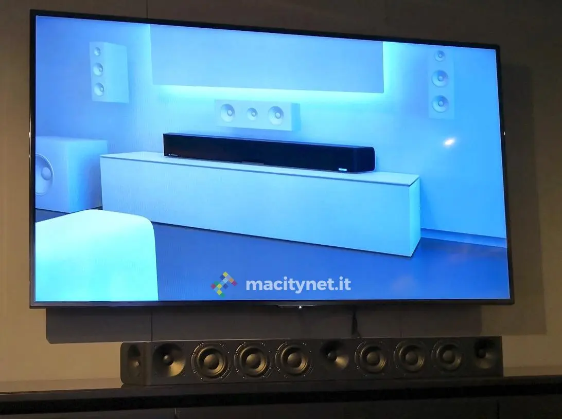 Nella sala demo erano installati in pratica due sistemi, uno con altoparlanti 9.1 discreti e l’altra era una bella soundbar “Ambeo 3D Soundbar” con 13 diversi speaker da 4”: nove in fronte due inclinati all’estremita destra e sinistra e gli altri due inclinati verso l’alto. La gamma riproducibile parte da 30 Hz e un subwoofer potrebbe essere persino inutile.