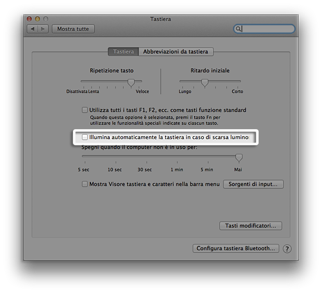 Ricordiamo che per default, i portatili con sensori di luce ambientale (ambient light sensors, ALS) consentono la regolazione automatica della luminosità della retroilluminazione della tastiera, sulla base della luce ambientale. In modalità predefinita, i tasti F5 e F6 funzionano solo quando i livelli di luce sono sufficientemente bassi perché il sensore attivi la tastiera con retroilluminazione. Coprendo il sensore, è possibile effettuare un test sulla funzionalità della tastiera con retroilluminazione e regolarla con i tasti F5 e F6.