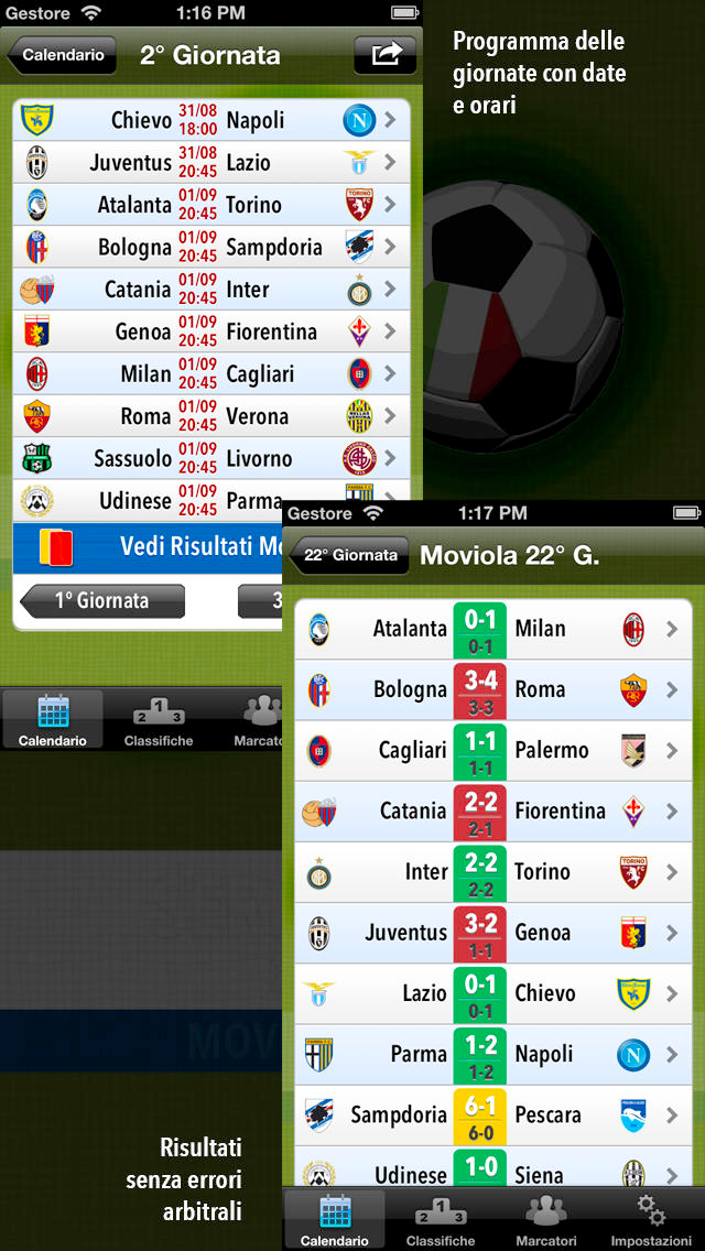 E’ possibile segnalare ai nostri amici presenti su Facebook la classifica reale e il dettaglio di una partita. Mentre tutte le altre funzioni sono contenuta nell’app che si scarica gratuitamente dallo store da qui, la funzione moviola è venduta in app a 89 cent.
