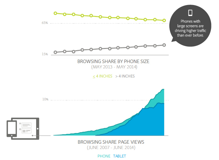 Apple deve lanciare un iPhone con schermo più grande per fermare il declino delle proprie quote di mercato nei browser web mobile. Il suggerimento assolutamente non velato indirizzato a Cupertino proviene da Adobe che nella nuova ricerca 2014 Mobile Benchmark Report fa il punto della situazione sui principali indicatori per il consumo di Internet da parte degli utenti.