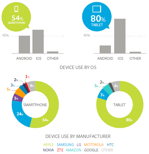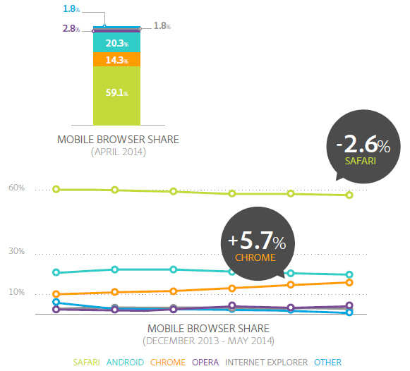 Per quanto riguarda i software di navigazione web, Chrome Mobile aumenta la propria quota di mercato del 5,7% fino ad arrivare al 34,6% mentre Safari Mobile è diminuito del 2,6% toccando quota 59,1%. Così nonostante il leggero calo i dispositivi mobile di Cupertino continuano a dominare le visite web con il 54% di iPhone e ben l’80% quelle effettuate su iPad. Samsung insegue a grande distanza Apple con il 24% delle visite generate da uno smartphone sud coreano e solo il 7% da un tablet del costruttore dei Galaxy.
