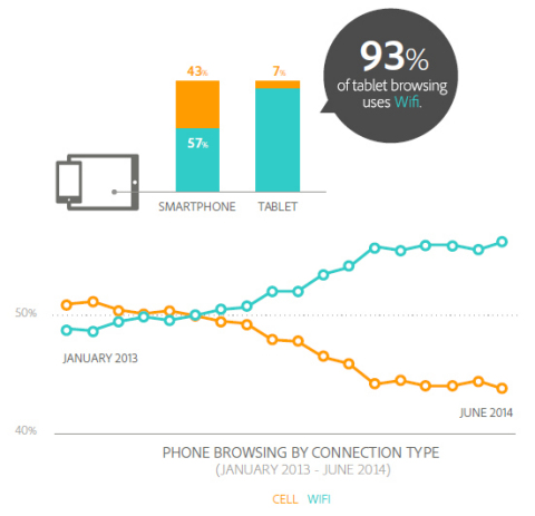 Per quanto riguarda il collegamento usato cresce il Wi-Fi scelto dal 50% degli utenti di smartphone e per ben il 93% degli utenti di tablet. Rilevato un boom di iMessage del 259% per la condivisione di contenuti digitali provenienti da pubblicazioni digitali, infine aumenta  l’uso di iBeacons e del geotag per il marketing: si prevede che dal 18% attuale degli addetti marketing che usano iBeacons raddoppierà nel 2015, mentre il GPS è già usato dal 49% degli addetti ai lavori. La ricerca di Adobe è stata realizzata a partire dai dati aggregati di Adobe Marketing Cloud e Adobe Digital Publishing Suite su dati complessivi di 18 miliardi di visite in oltre 10mila siti web e oltre 700 milioni di sessioni d’uso di app mobile. La ricerca 2014 Mobile Benchmark Report è disponibile completa online.