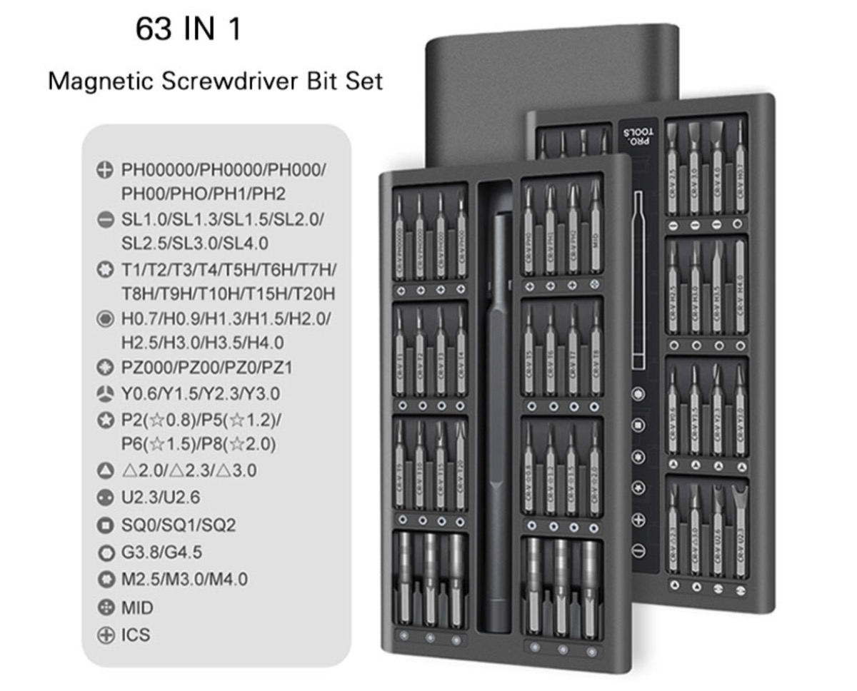 Nel complesso, il box contiene dai cacciaviti più comuni, come quelli a taglio e a croce, a quelli più specifici: triwing, torx, punte esagonali, triangolari, e altre ancora, per un totale di 13 differenti tipologie di punte.