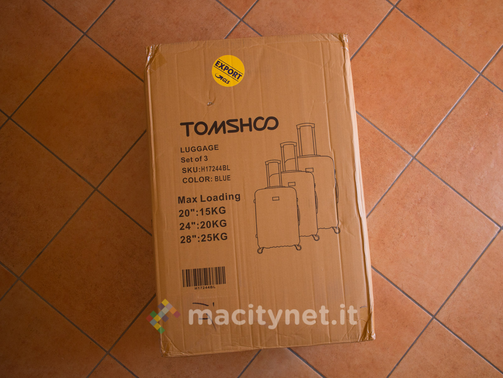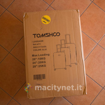 Le valigie Tomshoo che abbiamo provato nelle scorse settimane sono tre, identiche nel numero di tasche e nelle principali funzioni, differendo quasi unicamente per le dimensioni. La più piccola, da 20‘’, può caricare fino a 15 Kg (vuota pesa 2.4 Kg) ed è delle misure giuste per poter essere scelta come bagaglio a mano in caso di viaggi in aereo mentre le altre due, rispettivamente da 24‘’ (massimo 20 Kg, vuota pesa 3.3 Kg) e 28‘’ (massimo carico 25 Kg, 4.1 Kg è il peso della sola valigia) sono pensate per essere messe invece in stiva.
