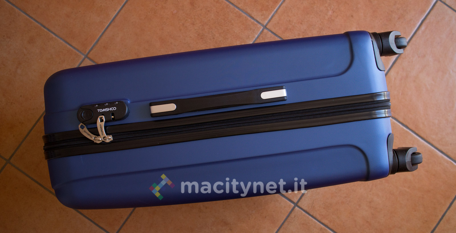 Sul lato superiore trova posto un’ampia maniglia (22 centimetri) per metà in robusta plastica, mentre la metà inferiore è in morbida gomma, una scelta che abbiamo apprezzato in quanto, con le valigie cariche, ne rende il trasporto più agevole senza ferire o affaticare le mani.