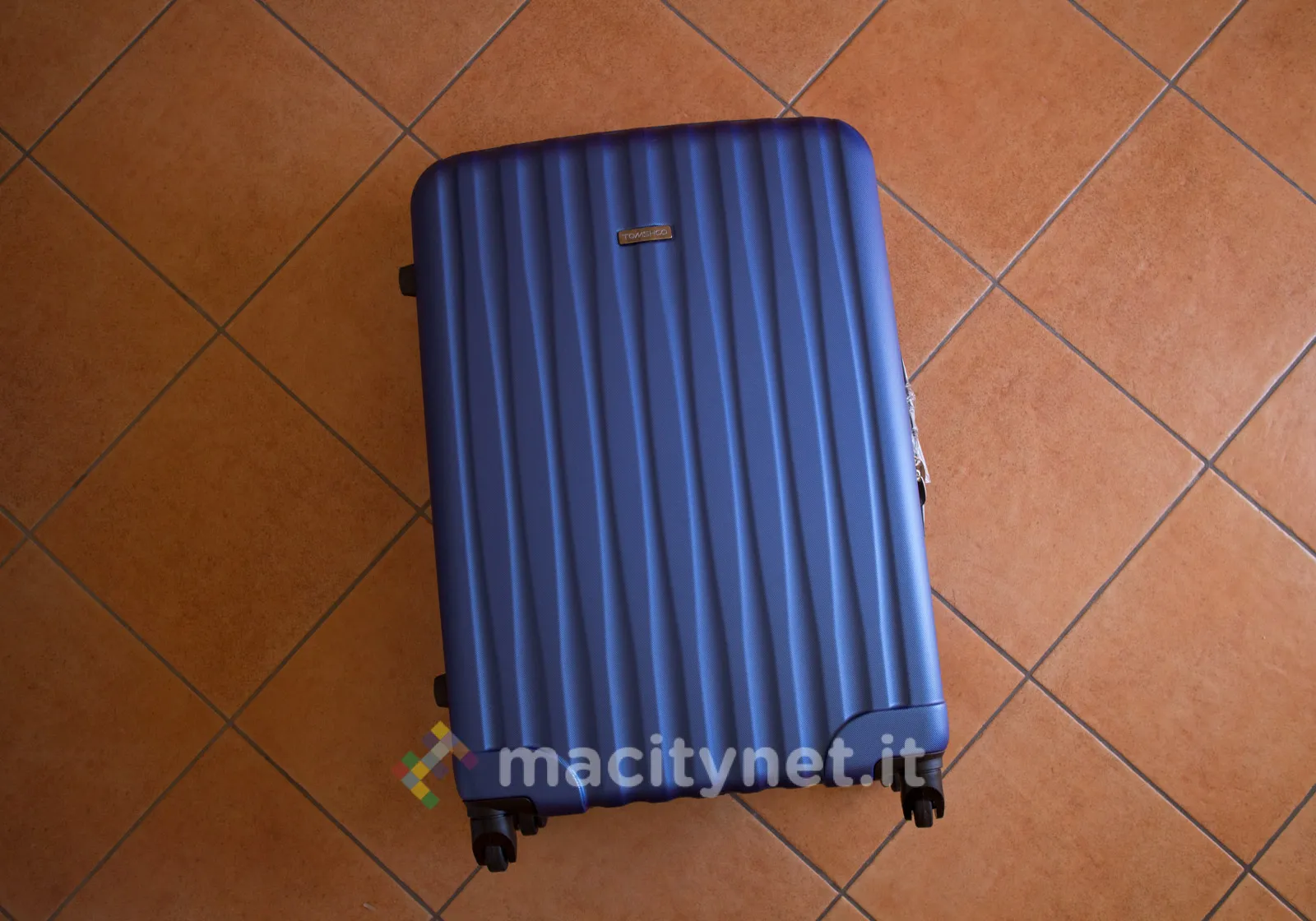 Eccezion fatta per le dimensioni le valigie, come dicevamo, sono pressoché uguali tra loro. Il guscio esterno, nel nostro caso di colore blu, è realizzato in ABS, un polimero termoplastico che, nonostante la leggerezza, assicura robustezza e flessibilità. Non sono infatti completamente rigide ma, soprattutto al centro, con una buona pressione si flettono leggermente, tuttavia i robusti inspessimenti interni evitano che si possa deformare irreversibilmente, riportandola alla forma originaria a schiacciamento terminato. Sono morbide anche ai lati ed in prossimità della cerniera mentre risultano impossibili da flettere alle cornici e in prossimità degli angoli.