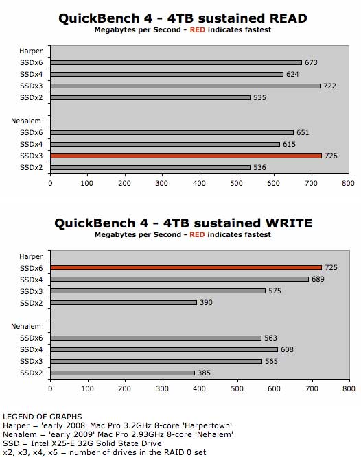 Il sito Barefeats ha testato un Mac Pro del 2008 e un nuovo Mac Pro 2009 confrontando le performance di una configurazione software RAID 0 sfruttando 2, 3 4 e 6 dischi Solid State. I drive utilizzati sono i velocissimi Intel X-25E (la “E” sta per Enterprise, un settore normalmente riservato a dischi SAS/SCSI per via delle loro elevate prestazioni). Dai grafici pubblicati da Barefeats emergono alcuni dati interessanti: