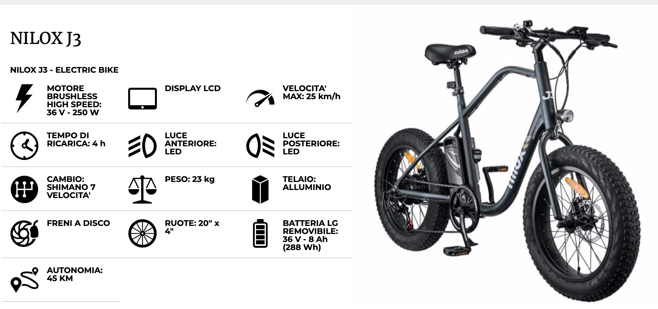 Potente e robusta anche nell’aspetto, Nilox J4 è dotata di cambio SHIMANO a 7 velocità, motore brushless High Speed da 36 V – 250 W e batteria removibile LG da 36 V – 8 Ah integrata nel telaio, ricaricabile in sole 4 ore e che ti permetterà di raggiungere 25 km/h e di percorrere in modalità assistita fino a 45 km.