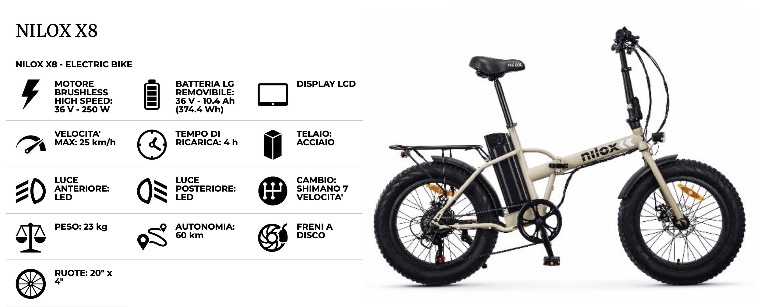 Nilox X8 è una bici elettrica a pedalata assistita che non conosce limiti, grazie alle gomme FAT da 20″ x 4”, al doppio freno a disco e alla batteria removibile LG da 36 V – 10.4 Ah che ti permetterà di percorrere in modalità assistita fino a 60 km.