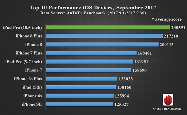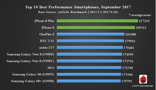 Non c’è storia: secondo AnTuTu, iPhone 8 e iPhone 8 Plus, sono i terminali più veloci di settembre, in grado di sbaragliare la concorrenza Android. Sono davvero tanti i top di gamma presenti in questa classifica, ma nessuno è in grado di avvicinare i due device Apple.