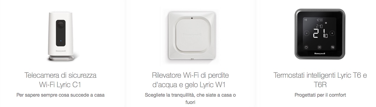 Per necessita di un termostato singolo o doppio da gestire via iPhone (anche su Homekit) e Android si può partire da un modello Lyric e poi abbinare sia un sensore di allagamento con cavo di prolunga ed una telecamera di sicurezza in grado di attivare l’allarme pure a distanza anche “ascoltando” la sirena di un allarme specifico come un sensore antincendio o un sensore per il monossido di carbonio.