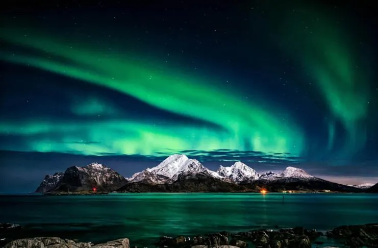Una spettacolare e vivace scatto delle luci del nord (aurora boreale) con il verde che si espande nel cielo scuro e stellato, montagne spolverate di neve e acque turchesi.