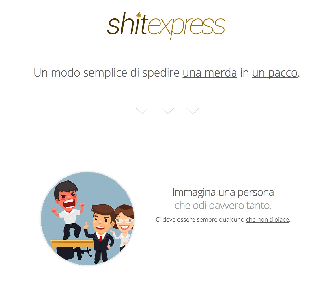 Non è uno scenario assurdo anche se potrebbe sembrare tale: grazie a Shit Express potrete con semplicità inviare una bella confezione di cacca al vostro peggior nemico (o al più spiritoso dei vostri migliori amici, a voi al scelta). Ma il pacchetto con il frutto del metabolismo, può essere indirizzato ad un capufficio, il rivale in amore, il bullo della situazione, l’ex fidanzato o l’ex fidanzata.